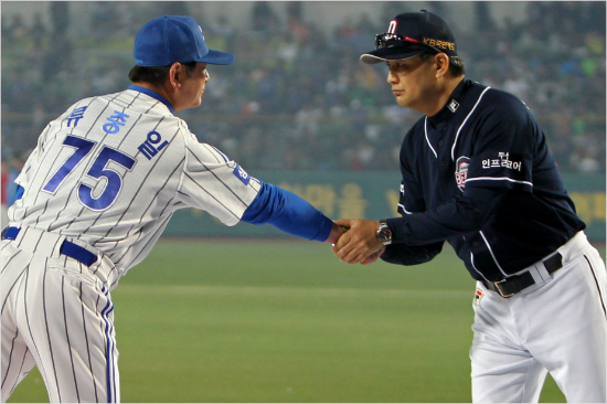 '1차전은 우리가 먼저 가져갑니다' 두산 김진욱 감독(오른쪽)이 24일 한국시리즈 1차전에 앞서 삼성 류중일 감독과 선전을 다짐하는 악수를 나누고 있다.(대구=삼성 라이온즈)