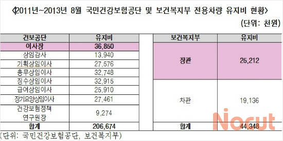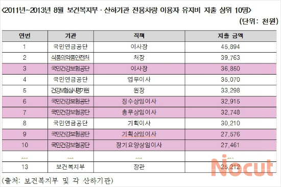 보건복지부 산하 기관 전용차량 이용자의 개인별 전용차량 유지비 지출 현황을 비교한 결과 지출액 상위 10명 중 5명이 건강보험공단의 이사장과 임원이었다. 복지부 장관은 13위에 불과했다.