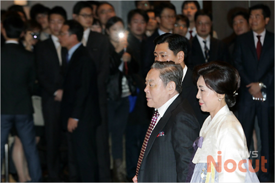 이건희 회장이 28일 오후 서울 장충동 신라호텔에서 열린 '삼성 신경영 20주년 기념 만찬'에 부인 홍라희 리움미술관장과 함께 참석하고 있다.