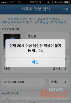 앱을 내려 받으면 이용안내를 두 차례 받은 뒤 사용자 정보 입력란이 나온다. 여기서 이름과 전화번호, 성별, 나이, 비상시 연락번호와 관계, 사진 등을 입력해 저장을 누르면 '현재 20세 이상 남성은 이용이 불가능합니다.'라는 사실을 뒤늦게 알 수 있다.