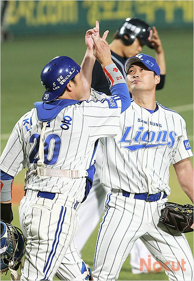 31일 오후 대구 시민야구장에서 열린 2013프로야구 한국시리즈 6차전 삼성과 두산의 경기에서 9회초 마무리 투수로 나와 승리를 지킨 삼성 오승환과 진갑용이 세리머니를 하고 있다.