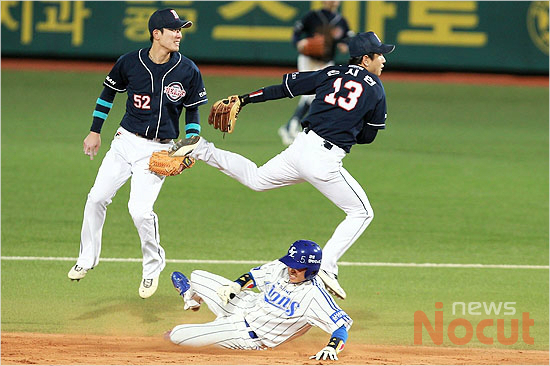 1일 오후 대구 시민야구장에서 열린 프로야구 한국시리즈 7차전 삼성과 두산의 경기 2회말 삼성 배영섭의 땅볼에 두산 유격수 손시헌이 1루주자 정병곤을 포스아웃 시킨 후 1루로 공을 던지고 있다.
