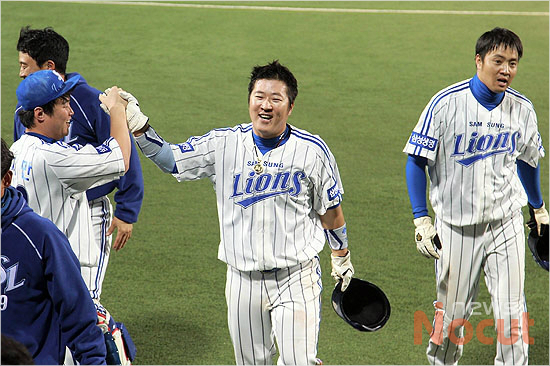 1일 오후 대구 시민야구장에서 열린 프로야구 한국시리즈 7차전 삼성과 두산의 경기 6회말 삼성 공격 박석민의 2타점 적시타에 홈을 밟은 최형우와 채태인이 동료들과 기뻐하고 있다.