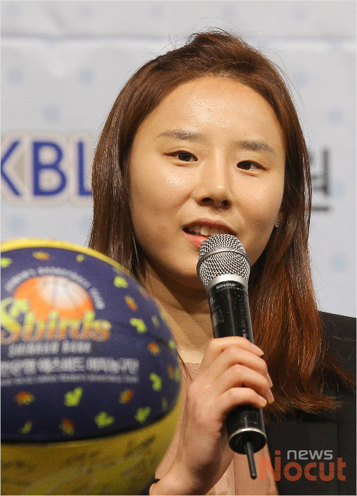 5일 오전 서울 청담동 리베라 호텔에서 열린 '우리은행 2013-2014 여자프로농구' 미디어데이에서 신한은행 최윤아가 각오를 밝히고 있다.