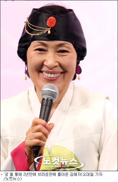 드라마 ''궁''에서 황태후 역할로 2년만에 안방 극장 복귀4일 오후 서울 강남구 임페리얼 팰리스 호텔에서 열린 MBC 새 수목극 ''''궁''''(인은아 극본, 황인뢰 연출)의 제작발표회. 2004년 11월 SBS 창사특집극 ''''홍소장의 가을'''' 이후 브라운관에서 모습을 감췄던 김혜자가 오랜만에 드라마 제작발표회 자리에 참석했다. 그것도 곱디 고운 궁중 한복을 차려입고 말이다. 아마도 자신의 기억으로도 이런 적은 처음이란다. 그리고 화려하고 거대하게 달라진 제작 발표회 현장이 무척 낯설게 느껴진다고 연신 ''아이 참 어색하네''소리를 연신 해댄다.