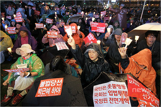 9일 오후 서울광장에서 열린 '특검도입 촉구 19차 범국민 촛불집회' 에 참석한 시민들이 촛불과 손피켓을 들고 구호를 외치고 있다.