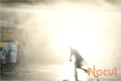 행진을 하던 시위대가 동대문역사문화공원 사거리를 점거하자 경찰은 15분 만에 물대포를 쏘며 진압에 나섰습니다.