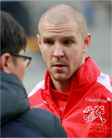 스위스 축구대표팀 필리프 센데로스가 한국과의 평가전을 하루 앞둔 14일 오후 서울월드컵경기장에서 열린 공개훈련에서 취재진과 인터뷰를 하고 있다.