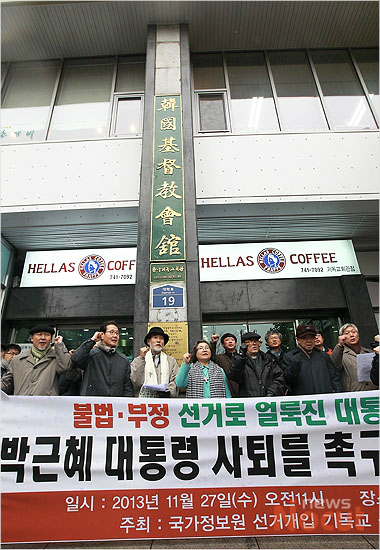 27일 오전 서울 연지동 한국기독교회관 앞에서 국가정보원 선거개입 기독교 공동대책위원회 주최로 열린 ‘박근혜 대통령 사퇴를 촉구하는 기자회견’ 에 참석한 기독교인들이 구호를 외치고 있다.