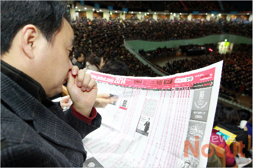 1일 오후 잠실 실내체육관에서 열린 진학사 주최 2014학년도 대입 정시 합격전략 설명회에 한 학부모와 대입 지원 참고표를 보고 있다.