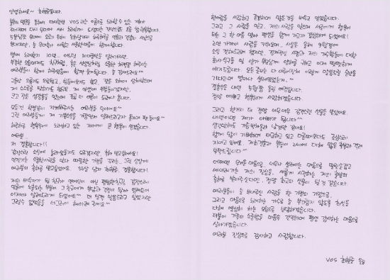 최현준은 먼저 최근 KBS 2TV ‘불후의 명곡’ 출연과 관련해 “다시 한 번 V.O.S라는 이름으로 노래할 수 있는 기회가 주어지고 다시 노래하게 됐다는 것만으로도 요즘 참 행복합니다. 늘 무대 후가 아쉽고 서운한 마음이 함께합니다”라며 근황을 전했다.
