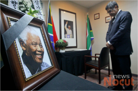 세계인권운동의 상징이자 남아공 최초의 흑인대통령으로 노벨평화상을 수상한 넬슨 만델라 전 대통령이 향년 95세의 일기를 끝으로 타계한 6일 오후 서울 한남동 주한남아프리카공화국 대사관에서 힐튼 안토니 데니스 대사가 애도를 표하고 있다.