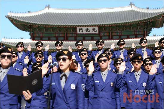 16일 오전 서울 광화문 광장에서 열린 '관광경찰대 출범식'에 참석한 관광경찰 대원들이 선서하고 있다. 관광경찰은 외국인 관광객을 대상으로 하는 불법행위를 단속하고 관광 중 불편사항을 처리한다. 윤성호기자
