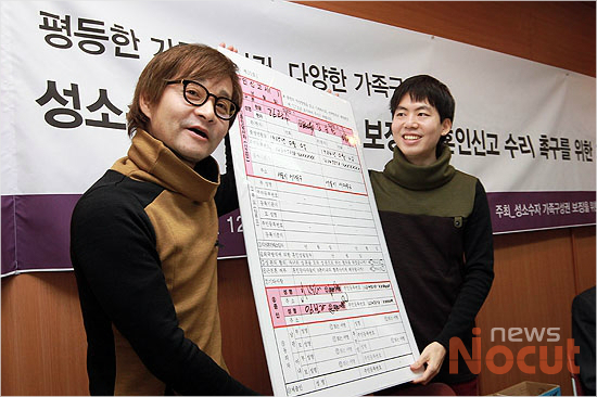 10일 오전 서울 통인동 참여연대에서 열린 ‘성소수자 가족구성권 보장 및 혼인신고 수리 촉구를 위한 기자회견’에서 김조광수-김승환 커플이 혼인신고서에 서명한 뒤 미소를 짓고 있다.