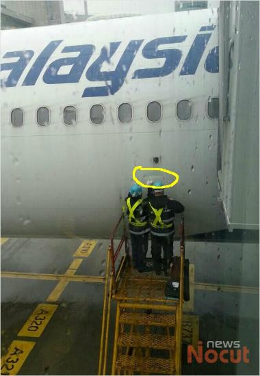 지난 9일 인천공항에서 말레이시아항공 소속 항공기와 탑승교 충돌로 파손된 기체를 정비하는 모습. (사진=공공운수노조 인천공항지부 제공)