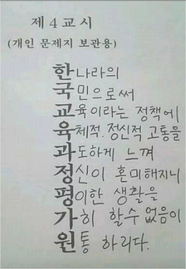 이 수험생은 길지만 한 문장으로 "'한'나라의 '국'민으로서 '교'육이라는 정책에 '육'체적·정신적 고통을 '과'도하게 느껴 '정'신이 혼미해지니 '평'이한 생활을 '가'히 할 수 없음이 '원'통 하리다"라며 12년 간의 교육과정을 끝마친 심경을 표현했다.