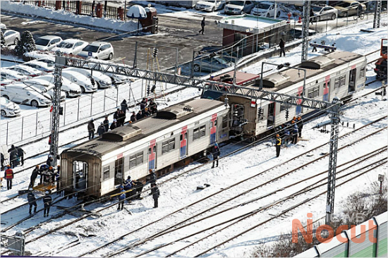 13일 오전 6시40분 서울 이문 차량기지에서 코레일 소속 1호선 전동차 10량 가운데 2량이 탈선하는 사고가 발생했다. 코레일 직원들이 복구작업에 한창이다.