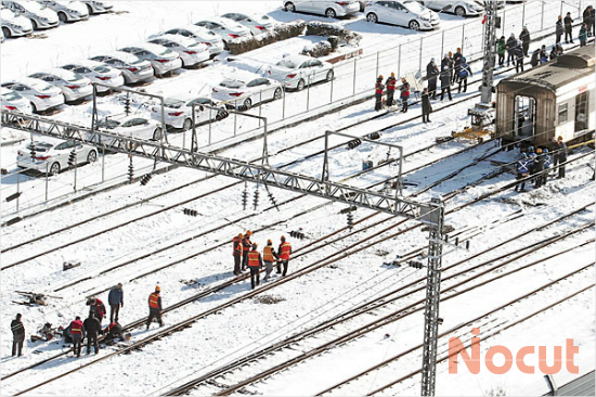 13일 오전 6시40분 서울 이문 차량기지에서 코레일 소속 1호선 전동차 10량 가운데 2량이 탈선하는 사고가 발생했다. 코레일 직원들이 철도를 점검하고 있다.