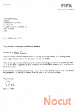 피파 블래터 회장, K-리그 챔피언 포항 스틸러스 축하 메세지