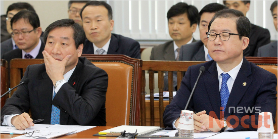 유정복 안전행정부 장관(좌측)과 이성한 경찰청장이 24일 오전 국회 안전행정위원회 전체회의에서 지난 22일 경찰의 철도노조 지도부 검거작전과 관련 의원들의 질의가 쏟아지자 곤혹스러운 표정을 짓고 있다.