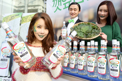 5일 오전 서울 광화문 청계광장에서 모델들이 깻잎 추출물을 함유해 숙취 없이 깔끔한 '깻잎담은 맥키스' 신제품을 선보이고 있다. 깻잎담은 맥키스는 최상품 국내산 보리를 혼합 숙성한 원주에 추부깻잎 추출물을 담아 맛도 좋고 혈액순환을 활발하게 해 건강에도 이점이 있다. /사진제공=맥키스