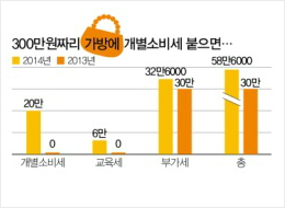 고가의 귀금속ㆍ시계 등에 부과되던 개별소비세가 고가 가방에도 붙는다. 관세를 포함한 수입신고가격이 200만원이 넘거나 국내 출고가격이 200만원이 초과하는 가방이 해당된다. 관세를 포함한 수입신고가격이 300만원짜리 해외브랜드 가방의 경우 200만원을 초과하는 100만원에 한해 20%의 개별소비세가 붙는다. 여기에 개별소비세의 30%에 해당하는 금액이 교육세가 발생한다. 이들 세금을 모두 더한 가격에 부가가치세 10%를 매기기 때문에 고가의 가방일수록 부담해야 하는 세금이 높아진다.