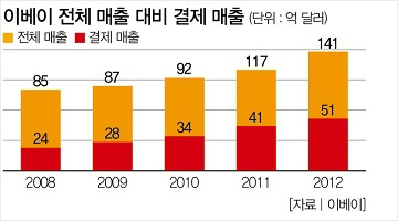 이베이의 사례는 두가지를 시사한다. 전자상거래 거래액의 증가와 더불어 결제시장이 성장하고 있다는 점이다. 특히 모바일 결제가 결제시장의 새로운 성장동력으로 떠오르고 있다. 글로벌 모바일 결제거래액은 2009년 256억 달러에서 2012년 1715억 달러로 3년 만에 7배 가까이 늘어났다. 이베이와 같은 비非금융기관을 통한 결제서비스 이용이 늘어나고 있다. 한국은행에 따르면 2011년 비금융기관 결제서비스 이용건수는 68억5000만건, 이용금액은 54조6787억원이었다. 전년 대비 각각 12.6%, 19.7% 늘어난 수치다.