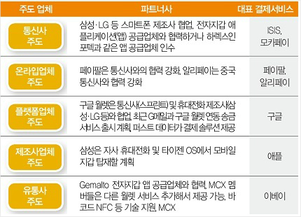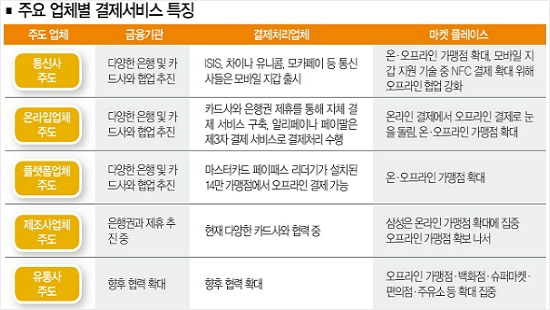 실제로 업계마다 결제서비스를 확보하기 위해 다양한 전략을 구사하고 있다. 주로 전자지갑 애플리케이션(앱)을 인수(M&A)하거나 전자결제업체와 협업하는 식이다. 미국 3대 통신사인 버라이존ㆍAT&Tㆍ티모바일 USA의 연합체인 ISIS(아이시스)는 전자지갑 서비스 출시를 통해 결제시장에 진입했다. 이들은 전자지갑이라는 플랫폼을 통해 결제서비스를 제공하는데, NFC(근거리이동통신) 기술을 기반으로 한다.