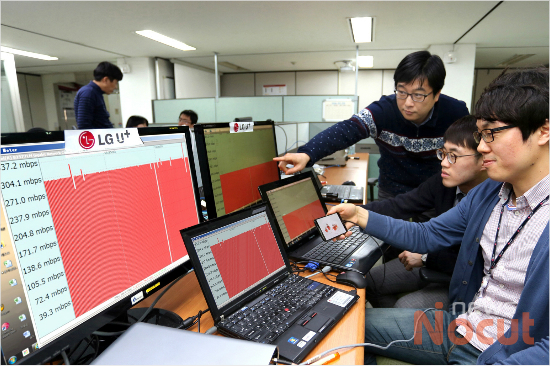 LG유플러스도 독산사옥(서울 금천구 독산동 소재)에서 40MHz폭의 2.6GHz 광대역 주파수 대역과 20MHz폭의 800MHz LTE 전국망 대역, 20MHz폭의 LTE-A망인 2.1GHz대역을 묶어 총 80MHz폭을 활용, 최대 300Mbps 속도를 제공하는 3밴드 CA 기술 시연에 성공했다고 밝혔다.