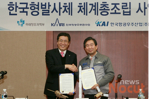 이에 따라 KAI는 이날 경남 사천 본사에서 한국항공우주연구원(항우연)과 '한국형 발사체 체계 총조립사업' 협약식을 개최하고 한국형발사체 개발의 성공적 추진을 다짐했다.