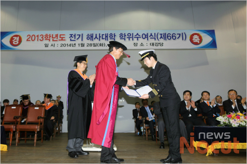 한국해양대는 28일 부산 영도 캠퍼스 학내 대강당에서 해사대 학생 350 명의 학위수여식을 가졌다.
