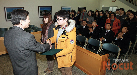 4일 오전 서울 목동 CBS교회에서 열린 ‘CBS 뉴질랜드 선교장학생 장학증서 수여식’ 에서 이재천 사장(왼쪽)이 선교장학생들에게 장학증서를 전달하고 있다.