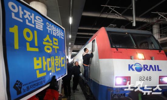 철도노조가 안전사고 위험으로 여객열차 기관사 1인승무에 반대하고 나선 가운데 5일 오후 서울 청량리역에서 청량리기관차 승무지부의 한 조합원이 중앙선 1인 승무 시범열차 기관차에 올라 항의하고 있다. 이날 중앙선 1인승무 시범열차는 노조의 저지로 편승승무원(노조 측)들이 탑승한 채 운행됐다.