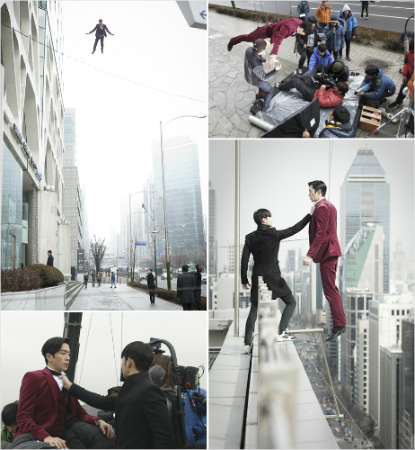 제작사 HB엔터테인먼트에 따르면 긴장감 넘치는 이 장면은 이재경(신성록 분)과 도민준(김수현 분)의 맞대결로 3일에 걸쳐 촬영된 결과물이다. 14회에서 가장 중요한 장면으로 손꼽히는 이 장면을 위해 신성록은 추운 날씨에도 와이어에 몸을 맡긴 채 약 10미터 이상을 오르내리며 연기 열정을 불태웠다는 전언이다.