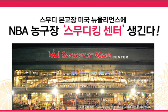 ‘스무디킹’(대표 김성완)이 미국 NBA ‘뉴올리언스 펠리컨스’의 홈구장을 ‘스무디킹 센터’로 선보이게 된 것을 기념해 2월 8일(토)~2월 9일(일)까지 전국 매장에서 ‘스무디 1+1 타임 서비스’ 및 ‘페이스북 축하 댓글 이벤트’를 진행한다