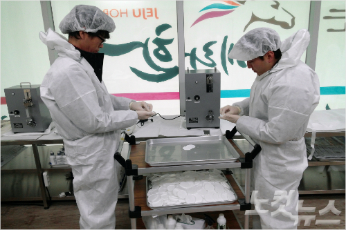 제주마산업(주) 직원들이 출시를 앞둔 국내 최초 100% 정제 말기름 크림의 용기를 소독하고 있다.