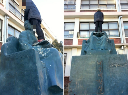 이 남학생은 세종대왕의 손에 들린 책을 밟고 서서 양손으로는 세종대왕의 머리를 붙잡았다. 세종대왕의 얼굴은 남학생의 허벅지 사이에서 눌려 있다.