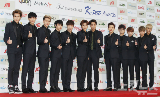 엑소가 12일 오후 서울 송파구 방이동 올림픽공원 체조경기장에서 열린 '제3회 가온차트 K-POP 어워드'에 참석, 포즈를 취하고 있다. 윤성호기자