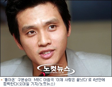 구본승이 벌써 서른 넷이다. 187cm의 휘청휘청한 큰키에 약간은 모자란 듯 개구장이 부잣집 아들 같은 이전의 이미지가 언뜻 비친다. 오랜만에 드라마로 컴백 소식을 알린다. MBC 새 아침극 ''이제 사랑은 끝났다''(김지수 극본, 백호민 연출)로 4년만에 브라운관에 돌아왔다. 영화 ''마법의 성''에서 전라의 연기를 보였고 지난해 KBS 단막극에 잠깐 얼굴을 비췄지만 다시 본격적인 연기를 하는 것은 이렇게 4년만이다.