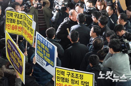 19일 오후 서울역 대합실에서 열린 철도노조의 ‘2.25 경고파업 및 총력투쟁 선포 기자회견 및 중앙선 1인 승무원 중단 촉구’ 기자회견에서 철도노조원들과 코레일 서울본부 관계자들이 몸싸움을 벌이고 있다.