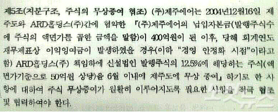 당시 맺은 업무협약서 제5조에는 '납입자본금이 400억 원이 된 이후, 당해 회계연도 재무제표상 이익잉여금이 발생하였을 경우 신설법인 발행주식의 12.5%에 해당하는 주식(액면가 기준으로 50억 원 상당)을 6월 이내에 제주도에 무상 증여하기로 한 사항이 이루어지도록 필요한 사항을 적극 협조 및 협력하여야 한다'고 명시하고 있다.