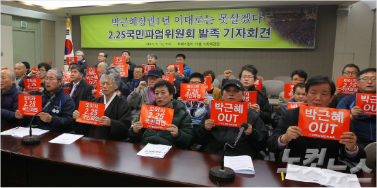 지난 12일 오전 서울 태평로 프레스센터에서 열린 '2·25 국민파업위원회 발족 기자회견'에서 참석자들이 구호가 적힌 손팻말을 들고 있다. 위원회는 오는 25일 서울광장에서 '박근혜 정권 1년 이대로는 못 살겠다 2·25 국민파업대회'를 열고 이와 동시에 전국 16개 도시에서 동시다발로 개최해 총 20만명 집결을 목표로 국민파업대회를 진행하겠다고 밝혔다. (송은석 기자/자료사진)