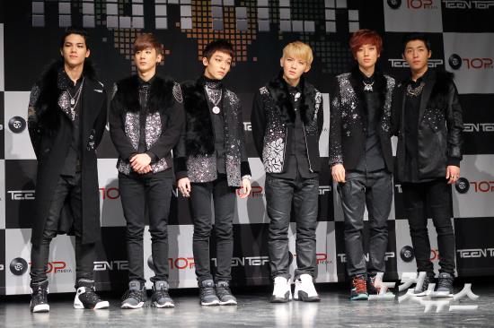 그룹 틴탑(캡 천지 엘조 리키 니엘 창조)이 23일 오후 서울 송파구 올림픽공원 올림픽홀에서 열린 2014 월드 투어 '하이킥 인 서울' 공연에 앞서 기자회견을 갖고 있다.