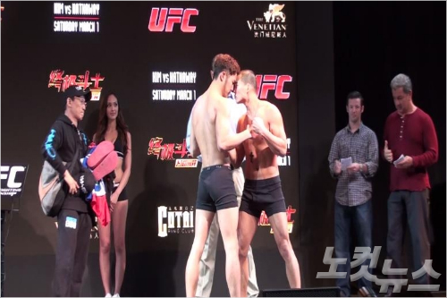 3월 1일(한국시간) ‘UFC in 마카오’ 대회에서 토쿠도메를 상대로 UFC 데뷔전을 갖는 전 로드FC 라이트급 챔피언 남의철은 계체량에서 자신의 트레이드마크인 눈싸움 포즈를 재현했다.
