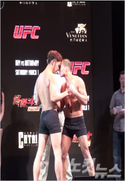 계체량에서 눈싸움을 벌이는 남의철과 토쿠도메. 사진=문수경 기자