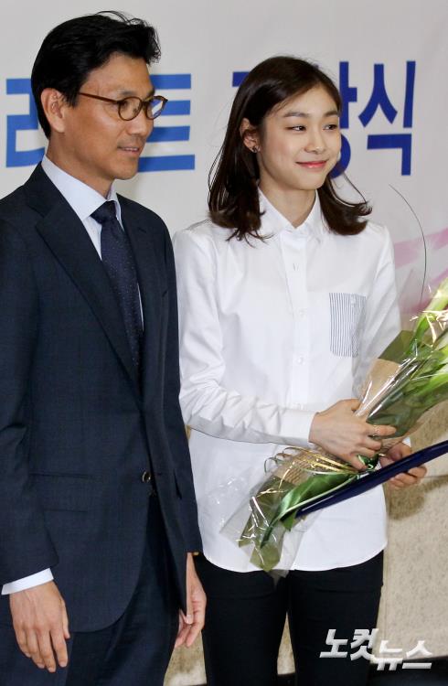 '피겨여왕' 김연아가 3일 오후 서울 공릉동 태릉국제스케이트장에서 열린 제22회 소치 동계올림픽 메달리스트 포상식에서 대한빙상경기연맹 김재열 회장으로부터 포상금을 받은 뒤 포즈를 취하고 있다.