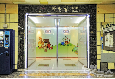 7호선 어린이대공원역 화장실.어린이를 고려해 캐릭터와 원색을 사용해 내부를 꾸미고, 동요를 틀고 있다. (자료제공=서울시)