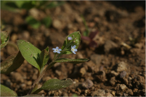 꽃마리라는 이름은 꽃대가 올라올 때는 꽃이 말려있는 모습 때문에 붙여졌습니다. 즉 꽃마리는 꽃말이인데 연음화하여 꽃마리가 된 것입니다. 비교적 긴 꽃대에 겨우 좁쌀만 한 크기의 꽃봉오리를 차례로 여는 모습이 앙증맞습니다. 꽃마리의 학명이 Trigonotis penduncularis입니다. 여기서 속명 Trigonotis는 '삼각형의'라는 뜻의 Trigonos와 '귀'라는 뜻의 ous의 합성어로 삼각형 모양의 열매에서 유래한 듯합니다. 그리고 종소명 penduncularis는 '꽃자루의'라는 뜻을 가진 희랍어입니다. 꽃봉오리가 돌돌 말려서 달린 모습 때문에 붙여진 듯합니다. 그리고 서양에서 부르는 이름도 학명과 같은 뜻의 Pedunculate Trigo-notis이며 국내에서는 꽃마리와 비슷한 물망초의 영어이름을 따서 forget-me-not이라 부르기도 하지만 서로 다른 종입니다.