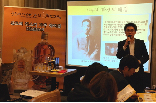 이번 세미나는 산토리 위스키 '가쿠빈'의 국내 론칭으로 '가쿠하이볼(가쿠빈+탄산수)'을 국내 소비자 기호에 맞춰 선보일 수 있는 방안을 연구하기 위해 마련된 자리다. 일본 산토리 위스키본사 가쿠빈 브랜드 담당자가 직접 한국을 방문, 업계 관계자들을 대상으로 진행했다.