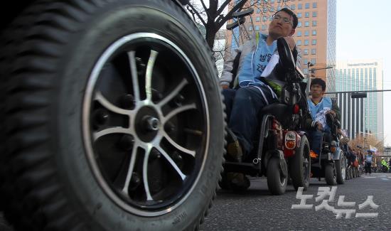 26일 오후 서울 종로구 보신각에서 열린 '4·20공동투쟁단 출범식 및 제10회 전국장애인대회'에서 대회를 마친 참가자들이 대한문으로 행진을 하고 있다.